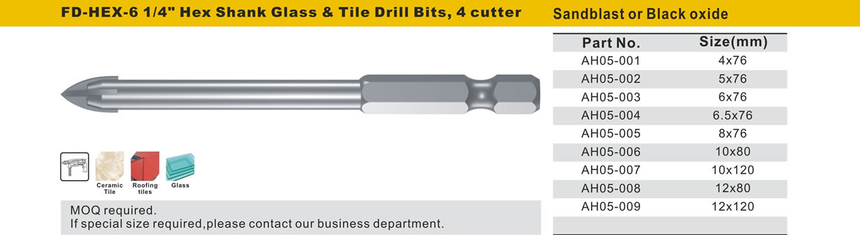 FD-HEX-6 1/4" Hex Shank Glass & Tile Drill Bits, 4 cutter